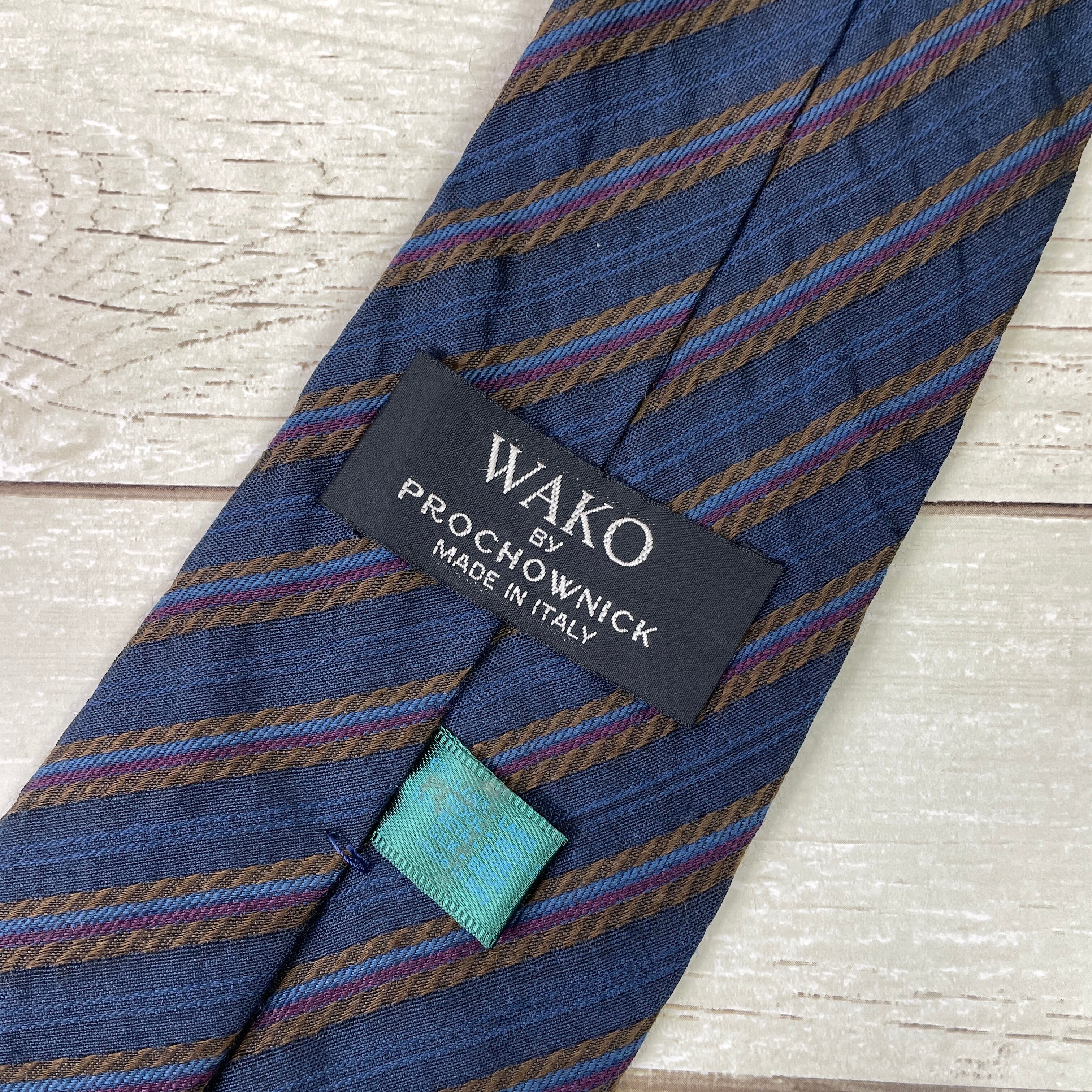 【良品】WAKO ワコウ/ ストライプ ウール ネイビー×カーキ系 ネクタイ