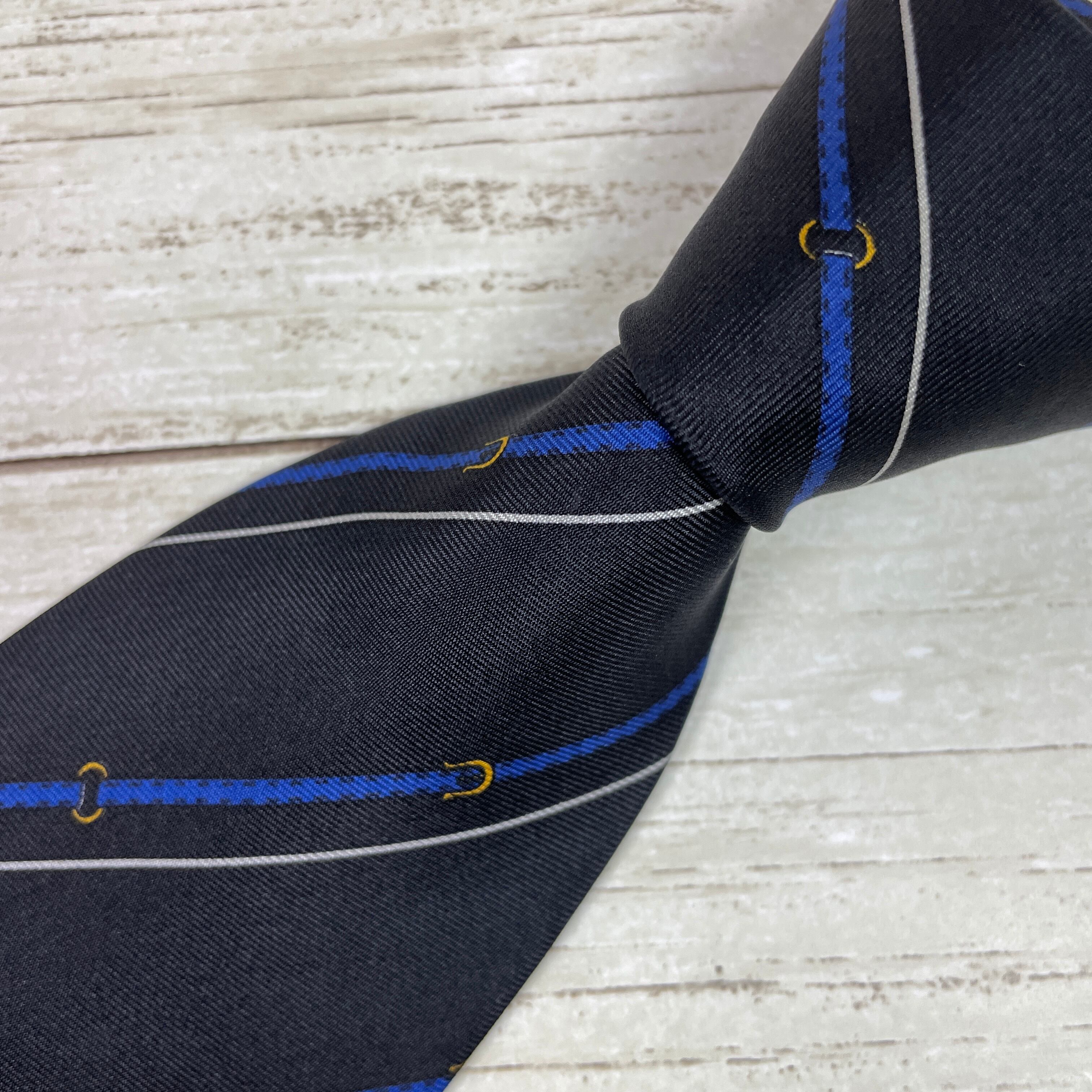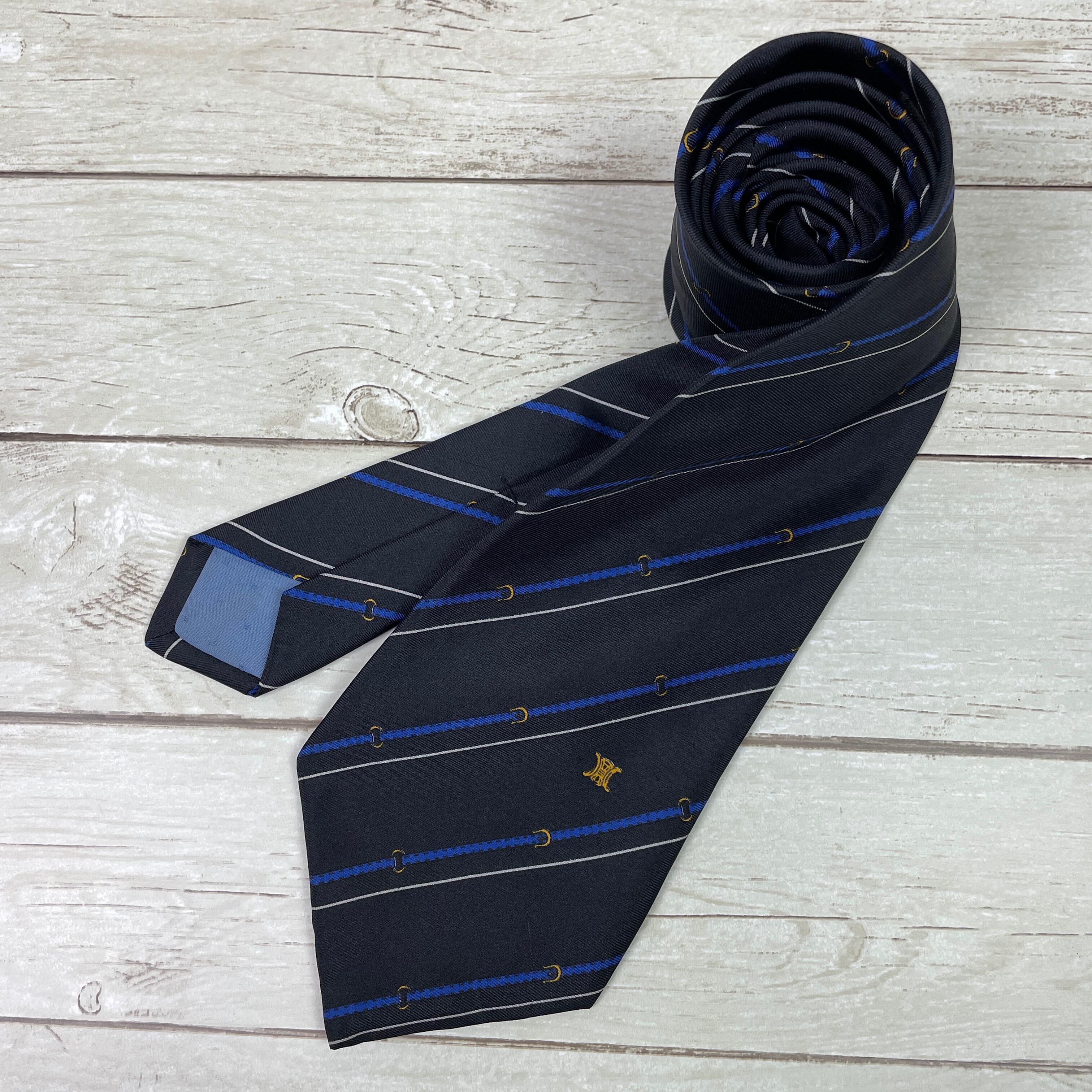 【美品】CELINE セリーヌ / ロゴ ストライプ ネイビー シルク ネクタイ