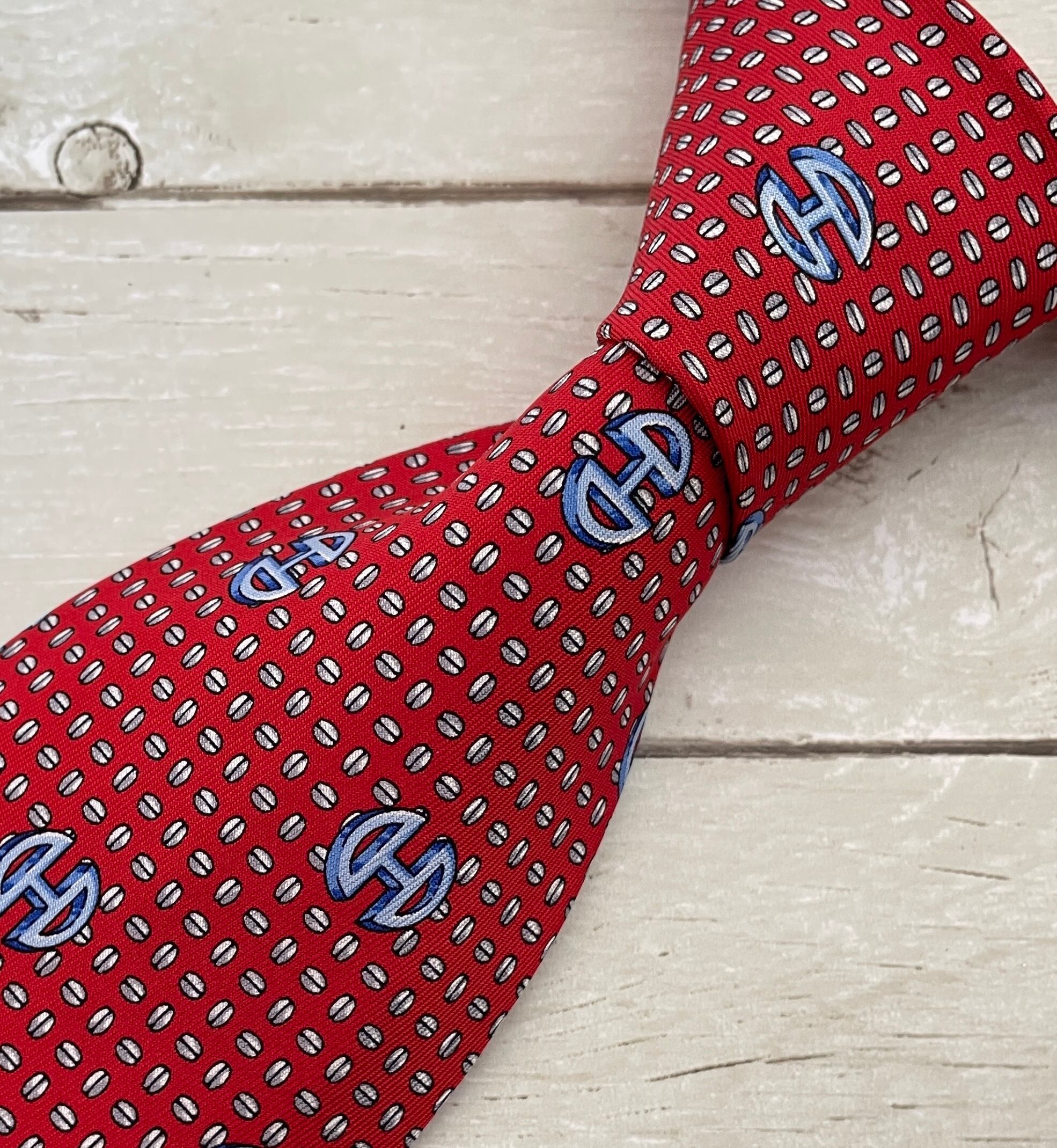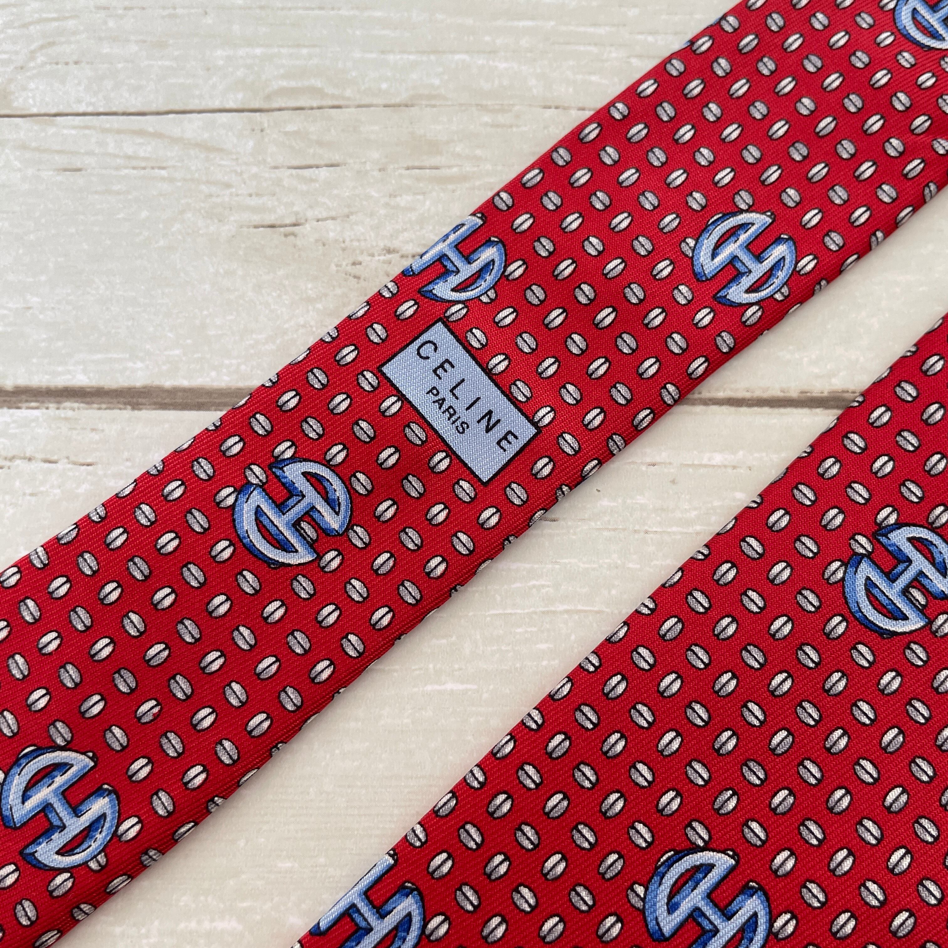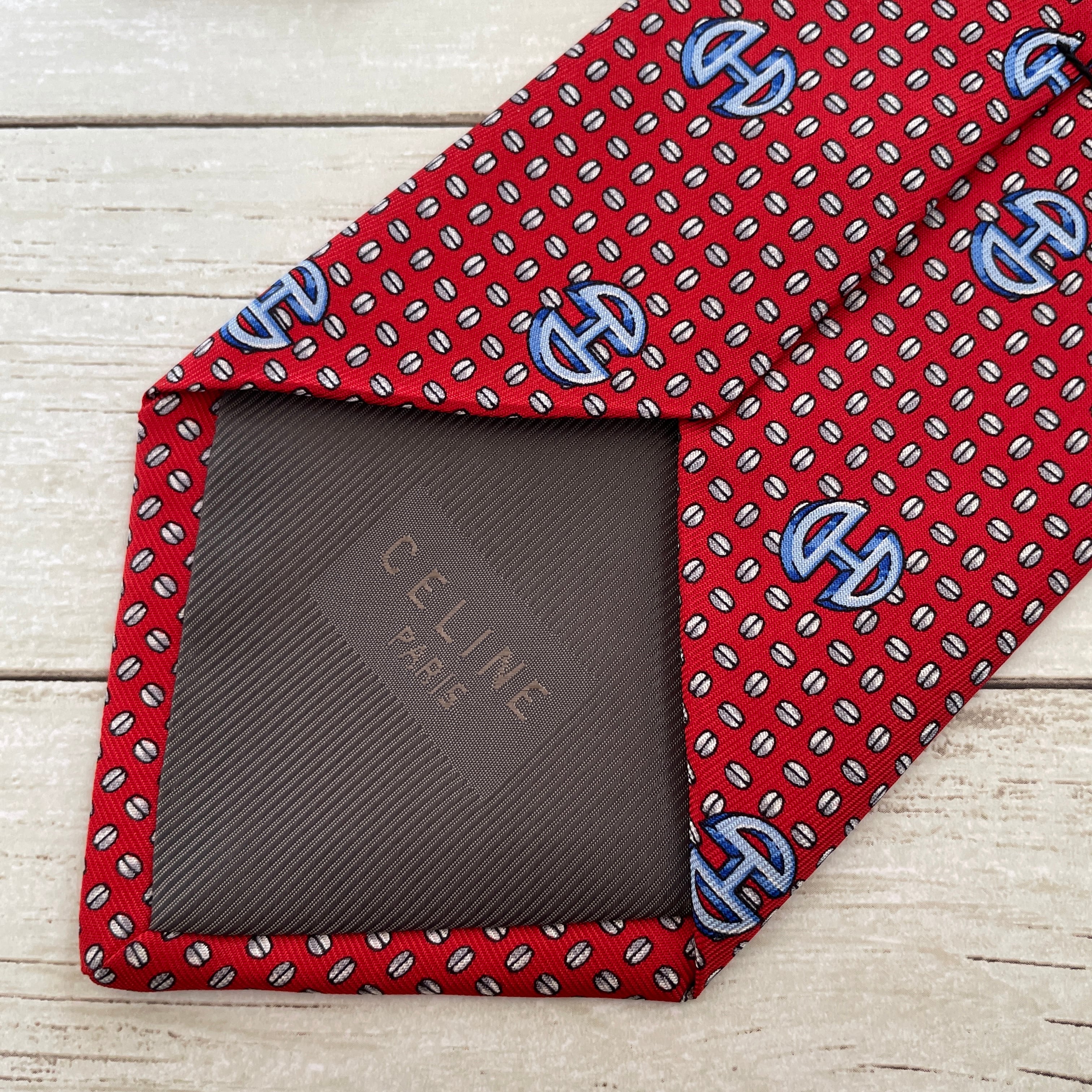 【美品】CELINE/セリーヌスペイン製 レッド×シルバー 総柄 ネクタイ