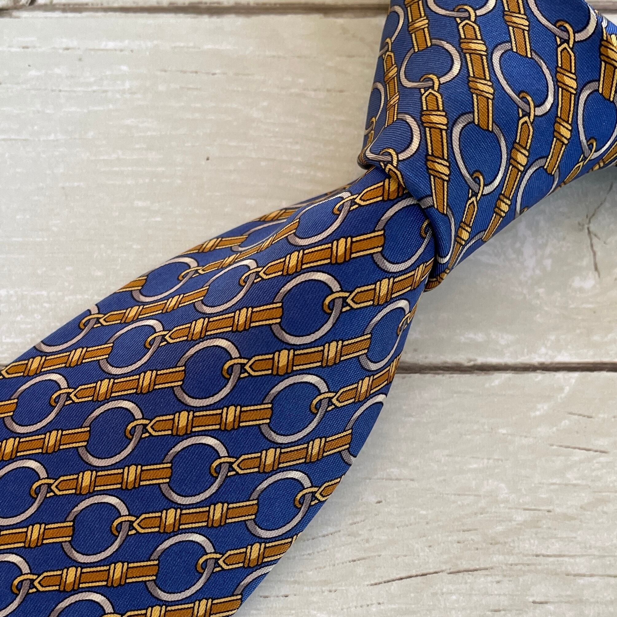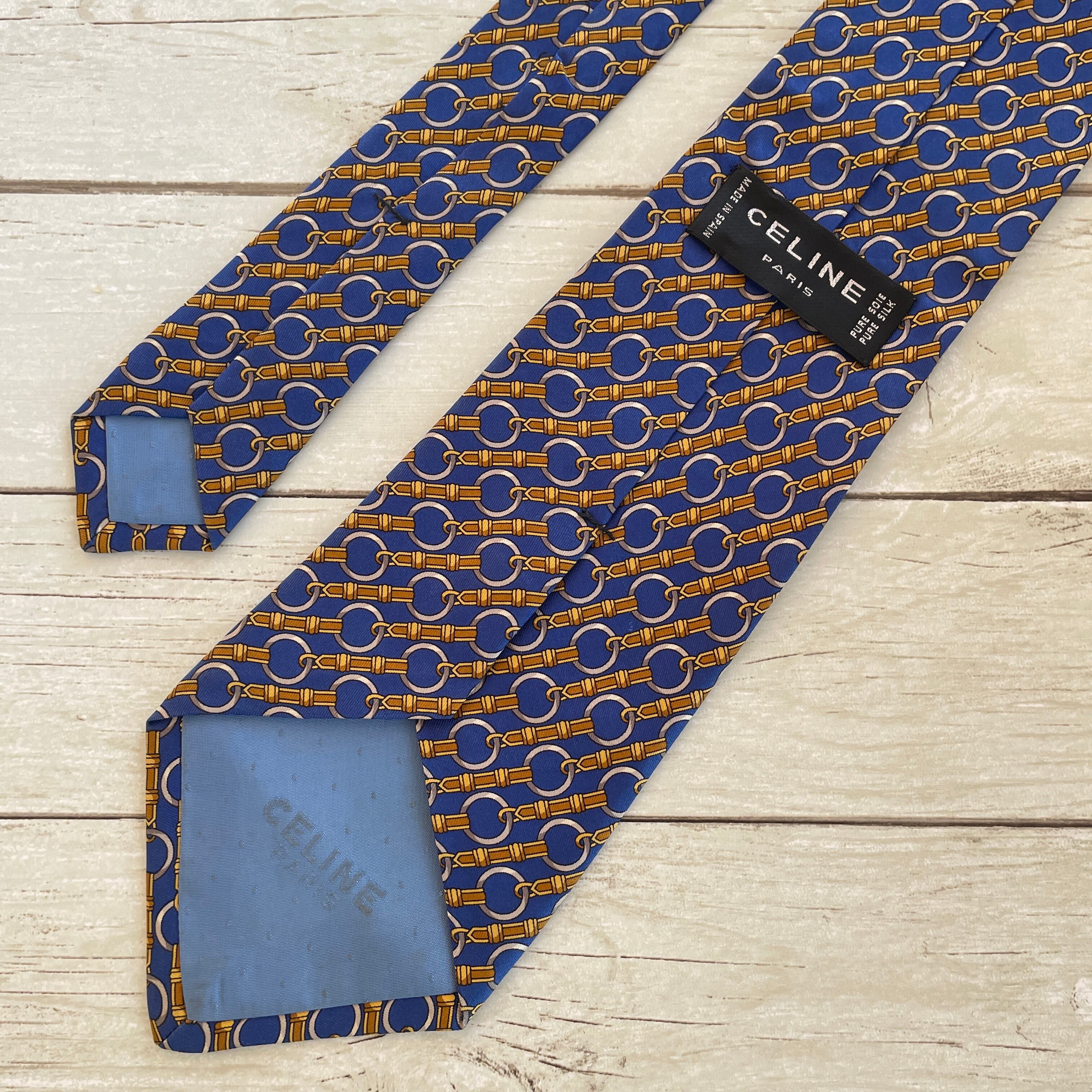 【美品】CELINE/セリーヌ ブルー×イエロー×ゴールド 総柄 スペイン製 シルク ネクタイ